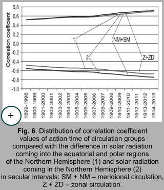 Correlational connection was investigated on the rows with time step of 100 years (secular interval) with shifting motion (1 year step) from the beginning of actual data massive (1899) up to present time (2013). Thus, the values of correlation coefficient (R) for intervals 1899-1998, 1900-1999 and so on, 16 secular intervals total (Fig. 1). It was found that high correlation between incoming solar radiation and difference in the incoming amount to equatorial and polar regions of the Northern hemisphere is found for two circulation groups: SM and ZD. Average R value of incoming radiation with ZD action time is 0.673, with SM action time 0.703. Average R value of radiation difference hitting equatorial and polar regions (showing interlatitudinal solar radiation gradient), with ZD action time comes to -0,635, with SM action time 0,756. ZD and SM response time upon incoming solar radiation (absence of atmosphere) and difference of solar radiation hitting equatorial and polar regions of the Northern hemisphere are contrary to each other. Stated that incoming solar radiation in modern era is reducing, and solar radiation difference hitting equatorial and polar regions is increasing, we can conclude that there is a certain tendency of decreasing the action time of ZD groups and increasing the action time of SM groups (Fedorov, 2014).