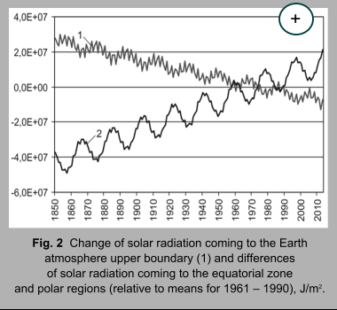 Thus, latitudinal contrasts in the Earth solar climate increase. A consequence of this effect can be intensified by meridian heat transfer from the equatorial area to polar regions and respective changes of thermal characteristics of both sea surface layer and the Earth global climate. The reduction of radiation coming to polar regions from 1850 to 2050 was determined upon 5.79Е+06 J/m2, which is 0.11% relative to the medium (from 1850 to 2050) value of incoming radiation for latitudinal zones (85° – 90° latitude). Increase in the equatorial zone is significantly smaller: in the equator zone (0° – 5° latitude), it equals 9.15Е+05 J/m2 (0.007%). Increase of difference of incoming radiation in these zones in 2050 will be 6.70Е+06 J/m2, which is by 0.09% higher than in 1850. This effects in spatial variability of solar radiation coming to the Earth ellipsoid (without respect to atmosphere) is associated with a secular trend to decrease the Earth axis inclination (relative to the perpendicular to the ecliptic plane). It is known that with the axis inclination angle increase, the solar radiation coming to polar regions is also increased, e.g., the latitudinal contrast of solar temperatures in hemispheres is smoothed and seasonal differences are increased. With the axis inclination angle decrease, the solar radiation coming to polar regions is decreased. Latitudinal contrasts are increased, and seasonal ones are smoothed (Monin, Shishkov, 1979; Monin, 1982; Monin, Shishkov, 2000). The calculated solar radiation coming during a tropical year (Fedorov, 2013) to the Earth (with no respect to atmosphere) and individual hemisphere was compared with SST anomaly dataset represented in the HadSST3 archive of the University of East Anglia in conjunction with the Hadley Center (http://www.cru.uea.ac.uk/cru/data/temperature). Furthermore, SST anomalies were compared with the difference of solar radiation coming to latitudinal zone 45° N to 45° S and radiation coming to the areas from latitude 45° to 90° (totally for hemispheres) for the Earth (Fig. 2). For hemispheres, this difference was determined between solar radiation of latitudinal zones 0° – 45° and 45° – 90° of each hemisphere. Comparison of calculated and radiation data and data given in temperature data archives (http://www.cru.uea.ac.uk/cru/data/temperature) shows as follows. The solar radiation coming to the Earth (and individual hemispheres) is reduced (Fig. 2). The anomaly value of the solar radiation coming to the Earth surface (in respect to the mean for 1961 – 1990) from 1850 to 2013 is 3.49Е+07 J/m2. The difference of solar radiation coming to the equatorial zone and polar regions of the Earth (and hemispheres) is increased for this period by 5.83Е+07 J/m2 (relative to the mean for 1961 – 1990). The SST temperature on the Earth and individual hemispheres is increased. The SST anomaly (relative to the mean for 1961 – 1990) from 1850 to 2013 is 0.691°С. For the northern hemisphere, the reduction of incoming radiation is 1.73Е+07 J/m2, difference anomalies—2.91 J/m2. The SST anomaly is marked by 0.697°С. For the southern hemisphere, the anomaly of incoming solar radiation is 1.76Е+07 J/m2, the difference anomaly is 2.92Е+07 J/m2. The SST anomaly in the southern hemisphere for the period is 0.704°.