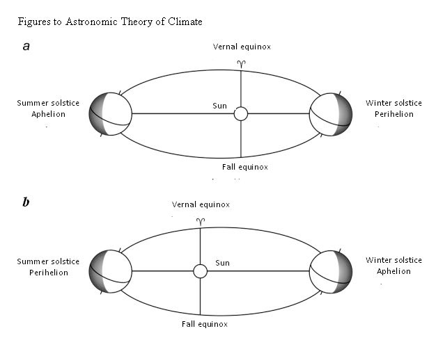 to winter solstitial point (longitude of perihelion 90°); b – in case of perihelion connection