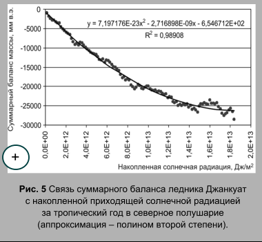 ПРИЧИНЫ По данным астрономических эфемерид (DE-406) проведены расчеты приходящей на верхнюю границу атмосферы солнечной радиации. На основе корреляционного анализа проведено сравнение значений суммарного баланса массы репрезентативного для Центрального Кавказа ледника Джанкуат с вариациями приходящей солнечной радиации и продолжительностью действия циркуляционных процессов в атмосфере. На основе уравнений регрессии рассчитаны значения суммарного баланса массы ледника Джанкуат на период с 1850 по 2050 гг. и определены, связанные с приходящей солнечной радиацией, тенденции изменения суммарного баланса массы ледника. Определено, что на непродолжительных временных рядах тенденция изменения суммарного баланса массы льда, связанная с приходящей солнечной радиацией, заметно нарушается влиянием циркуляционного фактора.