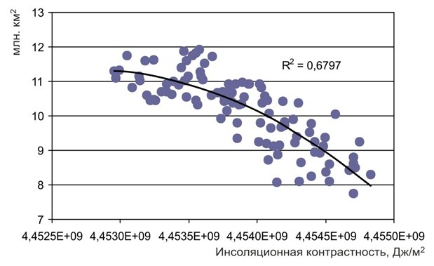 Связь минимальной площади морских льдов с инсоляционной контрпастностью и график полиноминального уравнения регресии для векового интервала 1907 – 2006 гг.