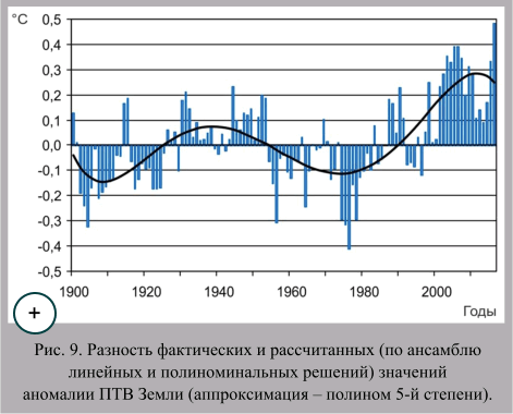 Рассчитанные, таким образом, значения аномалии ПТВ сравнивались с соответствующими фактическими значениями аномалии ПТВ (http://crudata.uea.ac.uk/cru/data/temperature, массив HadCRUT4) в интервале с 1900 по 2016 гг. (рис. 8).